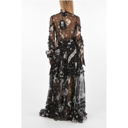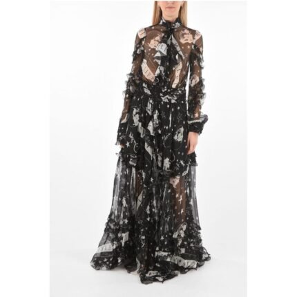 Philipp Plein COUTURE EST.1978 Sheer silk ruffles floor dress with tie nec