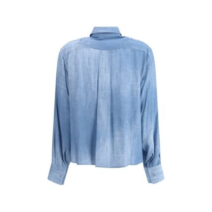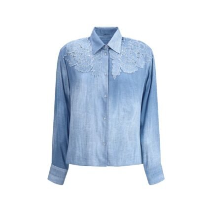 Ermanno Scervino’s Denim Shirt is a garment with a sophisticated and feminine character. It features a classic collar, which adds
