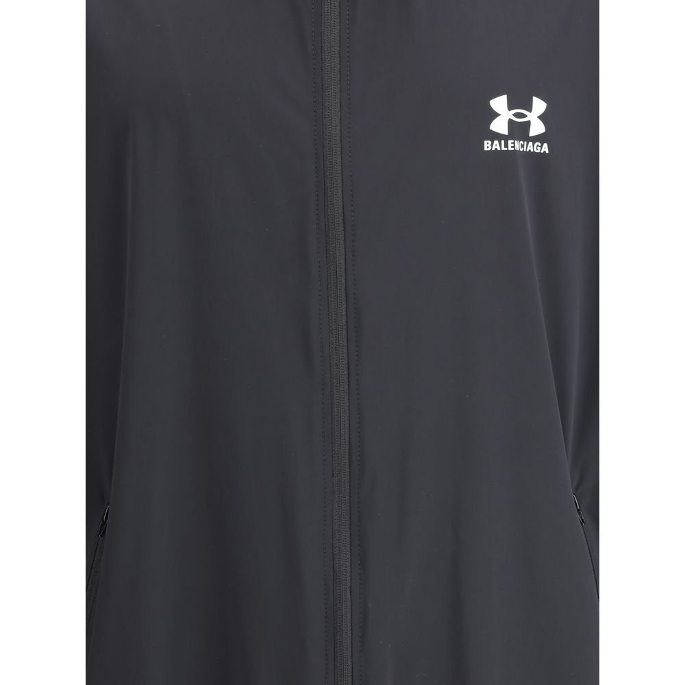 Jacket by Balenciaga, front zipper closure, collar with built-in hood, elasticized hem, elasticized sleeves, iconic brand monogram printed in contrast on front and back, monochrome pattern, oversize fit.