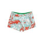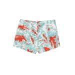 Elastic waist, metal snap button and zip closure, allover multicolor print, two side welt pockets, internal mesh.