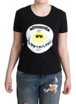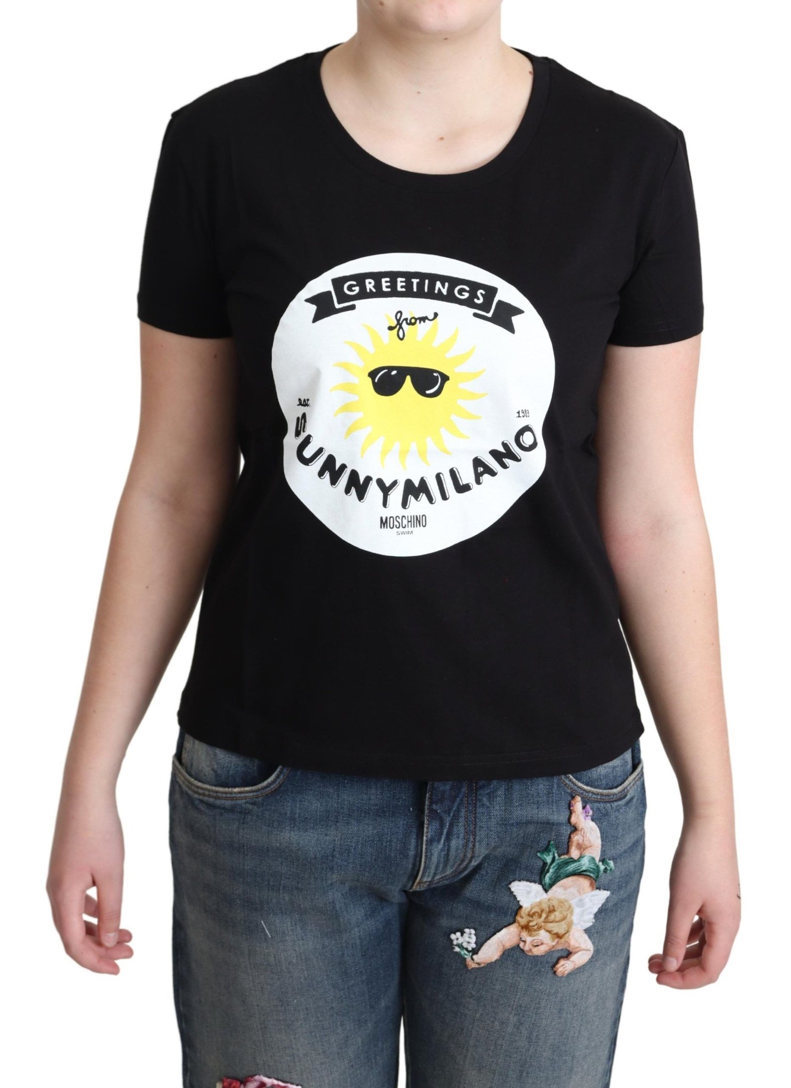Step out in style with the Moschino Round Neck Short Sleeve T-shirt. This sleek black tee showcases a striking sunny Milano print, perfect for adding a touch of designer flair to your everyday attire. Crafted from luxurious 100% cotton for ultimate comfort, it’s adorned with the iconic Moschino logo details for an authentic touch. Designed and made in Italy, this tee blends fashion-forward design with exceptional quality.