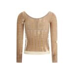Diesel’s M-calai Seamless Long Sleeve Sweater is made from a stretch cotton blend in a nude hue, creating a soft, fitted effect that fits snugly against the body, like a second skin. The lingerie-inspired design features a jacquard pattern on the bust, adding a touch of sophistication and originality. The line between clothing and underwear is blurred, with distressed stretch mark effects that give a lived-in, contemporary look. The neckline on the front adds a distinctive detail, completing a garment that combines comfort, style, and boldness.