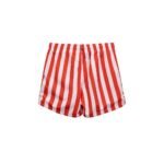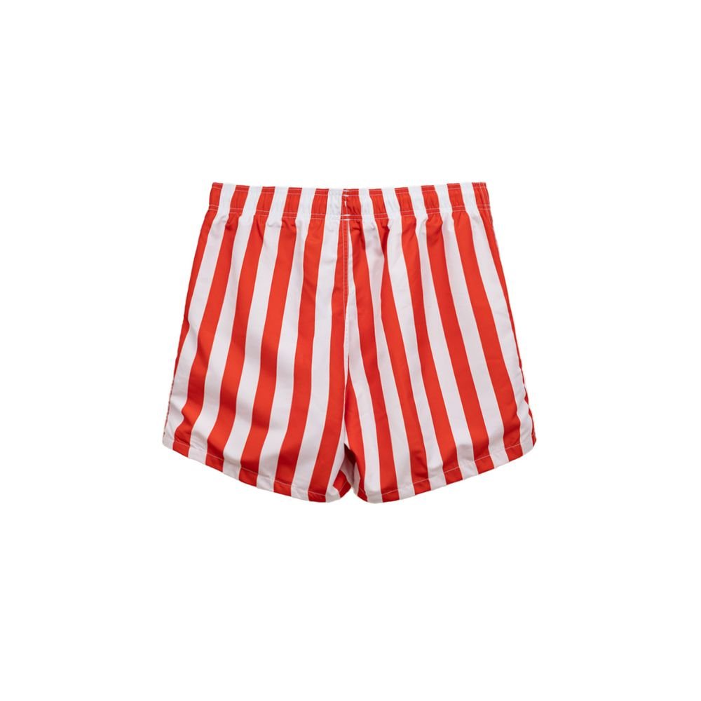Emporio Armani Red Striped Boxer Swimsuit. Allover red and white stripes, elastic waistband with adjustable drawstring waist, two side welt pockets, internal micro mesh lining.