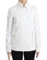 Step into elegance with this brand new, stunning GF Ferre white jacket. Crafted from the finest 100% cotton, this double-breasted piece defines sophistication. Its short model cut, coupled with smart flap pockets and exquisite button closure, makes it an ideal addition to your wardrobe, imbuing it with a blend of classic style and modern charm. The prominent GF Ferre logo details add an exclusive touch to this luxurious jacket, making it a must-have for fashion connoisseurs.