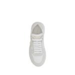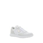 Prada’s leather Sneakers combine style and functionality with a contemporary, refined design. The front lace-up closure ensures a secure fit, while suede details add a touch of sophistication. The sleek and comfortable round toe is complemented by a notched platform sole that lends height and a modern look. The iconic triangular logoed plaque, applied on the side panel, and the brand’s monogram on the heel enrich the shoe with Prada’s distinctive signature mark. The branded insole completes the design, making these sneakers a perfect blend of luxury and comfort.