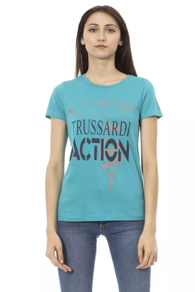 Revel in the essence of casual sophistication with this stunning Trussardi Action T-shirt. Crafted for the modern woman who values classic charm with a playful twist, it features a vivacious front print that elevates your everyday ensemble. Celebrate the blend of comfort and style in its serene Light Blue hue, precisely fashioned from a blend of premium Cotton and Viscose. Perfect for those who dare to make a bold statement while embracing effortless cool.