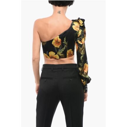 Philipp Plein COUTURE Floral Patterned Silk One-Shoulder Crop Top with Bow