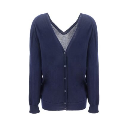 Cashmere Cardigan by Prada, featuring front button closure, ribbed cuffs, V-neck with ribbed trim on front and back, ribbed hem,