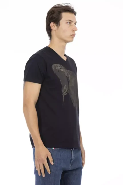 Elevate your style with the effortlessly chic Trussardi Action black tee. This V-neck wonder features a statement front print, seamlessly